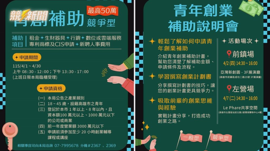 為協助青年創業團隊跨越成長關鍵期,高雄市政府青年局今年再度推出「競爭型」青創補助計畫,將自4月1日至4月30日開放受理申請,鎖定已具營運基礎、正準備擴大市場的在地青創事業,每案最高補助新台幣50萬元,盼透過資金挹注協助青年企業提升競爭力。