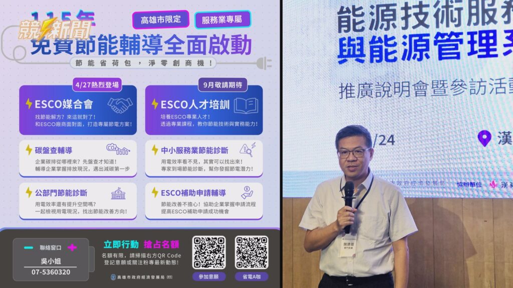 經發局專委魏建雄表示(圖右),漢神巨蛋透過節能設備與智慧監控,已達到逾二成顯著節電率。左圖為115年度ESCO節能推廣系列活動規劃。(圖:記者李佳龍/翻攝)