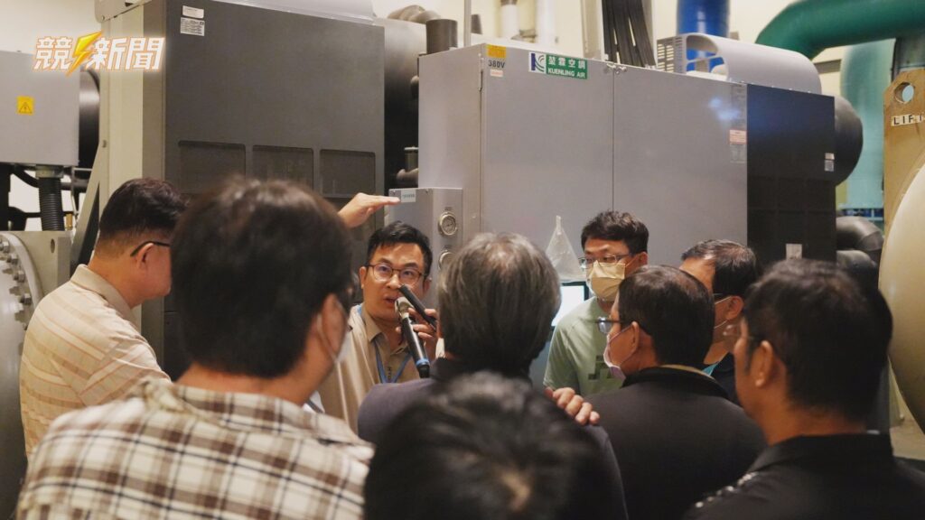 與會企業代表實地參訪漢神巨蛋機房,觀摩高效率冰水主機與水泵設備的改善成效,了解ESCO模式如何落實於大型商場節能。(圖:記者李佳龍/翻攝)