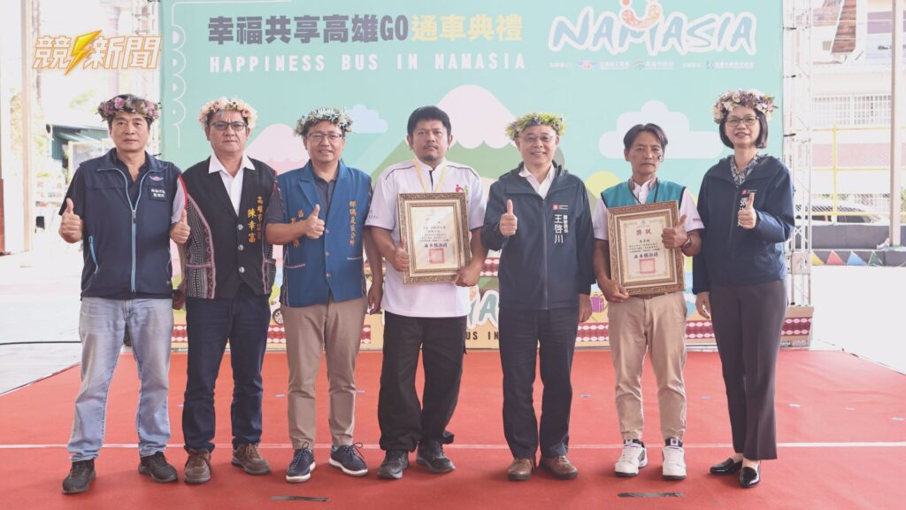 高雄市副秘書長王啓川(右三)與交通局副局長張淑娟(右一)頒發獎狀,感謝在地駕駛與相關單位共同推動偏鄉預約制接駁服務。(圖:記者黃小慧/翻攝)