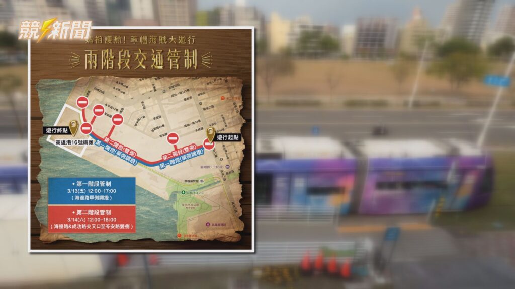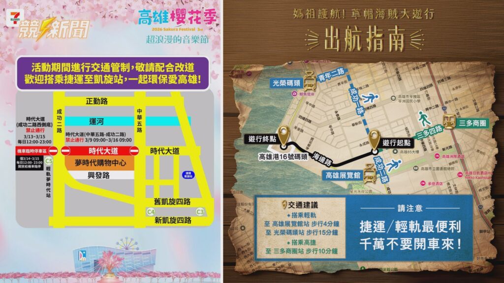 高雄週末要high翻天!「2026高雄櫻花季」13日起三天連爆夢時代廣場,韓團BOYNEXTDOOR、SUPER JUNIOR-D&E、VIVIZ等大咖接力飆唱,預計吸滿十萬歌迷。同一時間,14日「媽祖護航!草帽海賊大遊行」更神來一筆,大甲鎮瀾宮媽祖聖駕加持魯夫一團,從海邊路成功路口出發直衝高雄港16碼頭,動漫粉與信仰迷齊聚超吸睛。交通局早早拉警報,周邊時代大道、海邊路片區管制滿嚴,開車鐵定卡痠,喊話大家擺脫方向盤依賴。