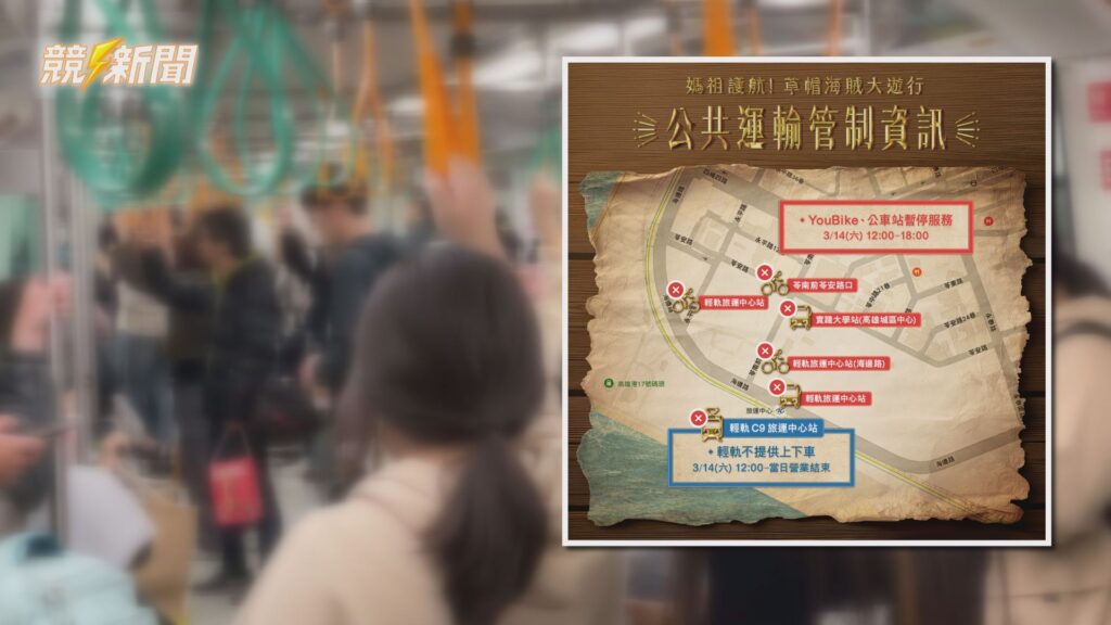 「媽祖護航!草帽海賊大遊行」活動範圍涵蓋海邊路等片區,交通局提醒民眾14日中午起輕軌C9旅運中心站將配合暫停服務,請改由鄰近站點進出。 (圖:記者李佳龍/翻攝)