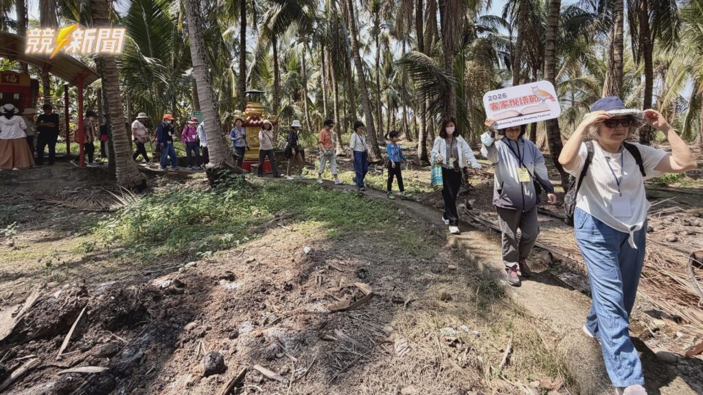 走讀隊伍民眾在椰林與果園間穿梭,感受高雄客庄獨特的生態導覽與人文景觀。(圖:記者李佳龍/翻攝)
