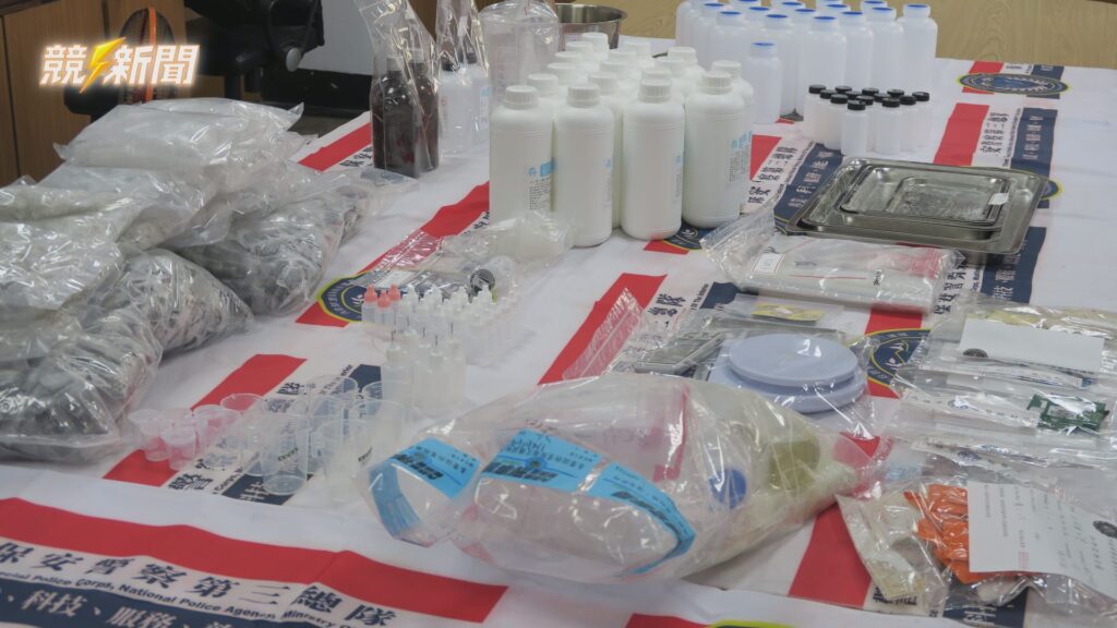 查扣贓證物有秤重儀器、分裝瓶與顏色各異的化學助劑,嫌犯企圖用哈密瓜、水蜜桃等口味掩蓋毒品氣味。(圖:記者李佳龍/翻攝)