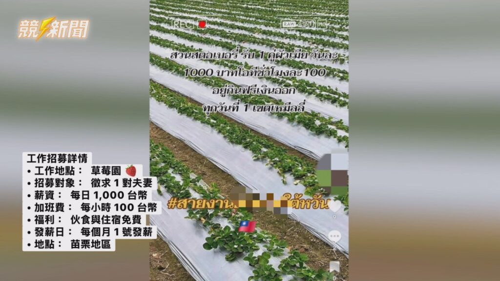 調查指出,該集團長期透過社群平台向泰國偏遠地區招募勞工,以農場工作、美景與女性形象照片包裝成「來台輕鬆打工」機會,吸引當地民眾借貸、賣地甚至出售房產籌措仲介費,每人支付約6萬泰銖後來台。受害者抵台後,不但被安排至苗栗草莓園等農場從事高強度勞務,每天工時長達16小時以上,還遭扣除住宿、交通與各類不明費用,實領工資遠低於基本待遇。