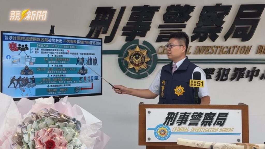 刑事局偵八大隊(第三隊)隊長陳崇貿說明,詐欺集團三層架構犯罪模式,桌上陳列的現鈔花束為洗錢贓物之一。(圖:記者李佳龍/翻攝)