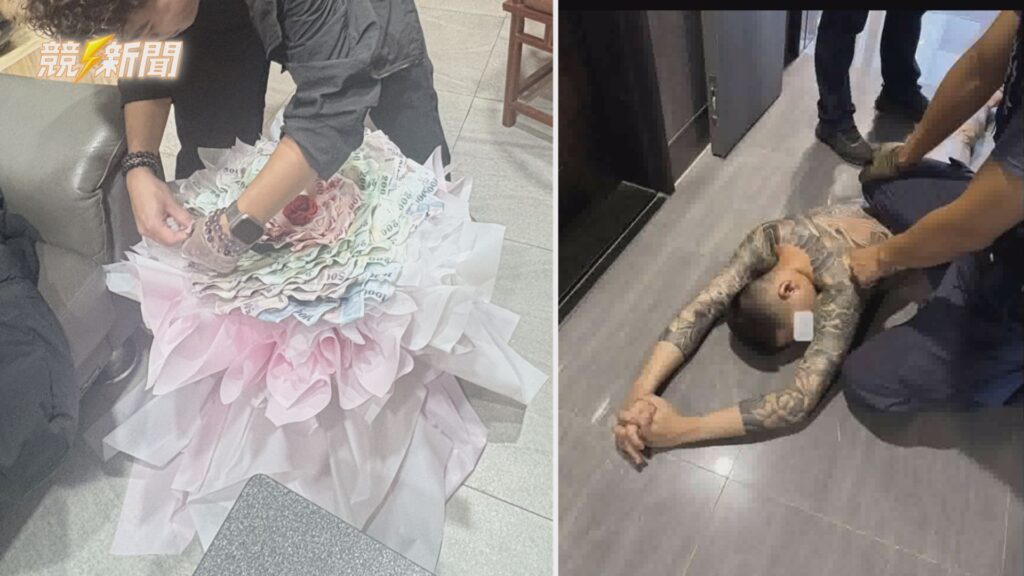 左圖為詐欺集團用以洗錢的現鈔花束贓物;圖右為警方現場壓制林姓主嫌。(圖:記者李佳龍/翻攝)
