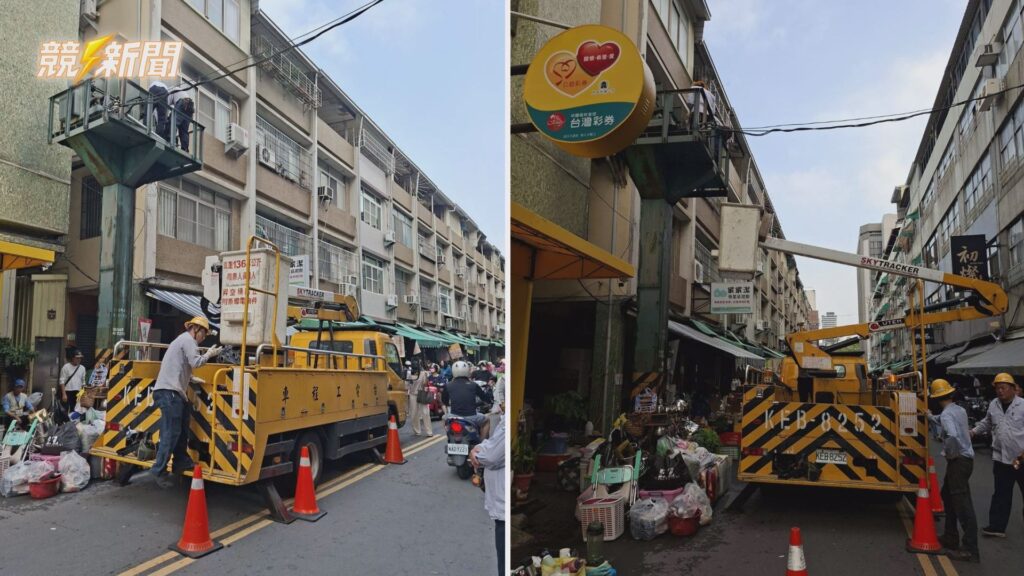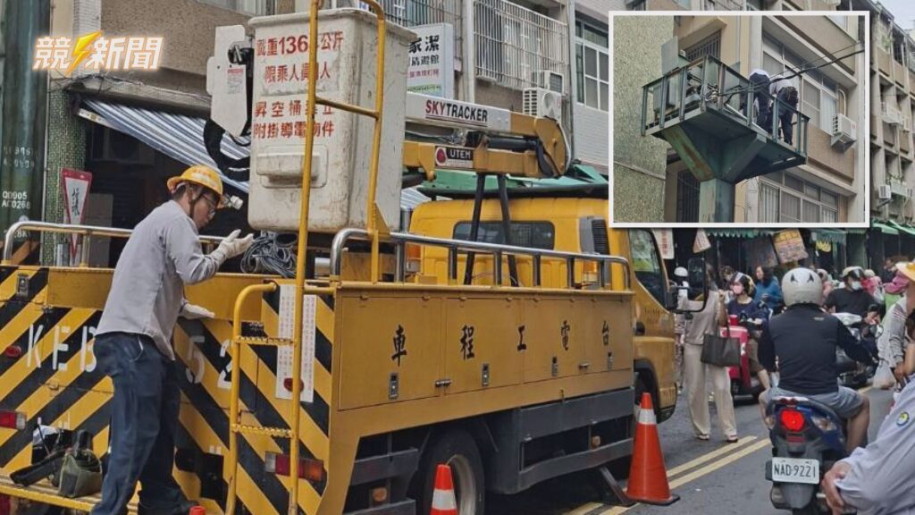 台電工程車於前金區傳統市場周邊展開搶修,因巷弄狹小且正值營業時段,增加大型車輛定位難度。(圖:記者李佳龍/翻攝)