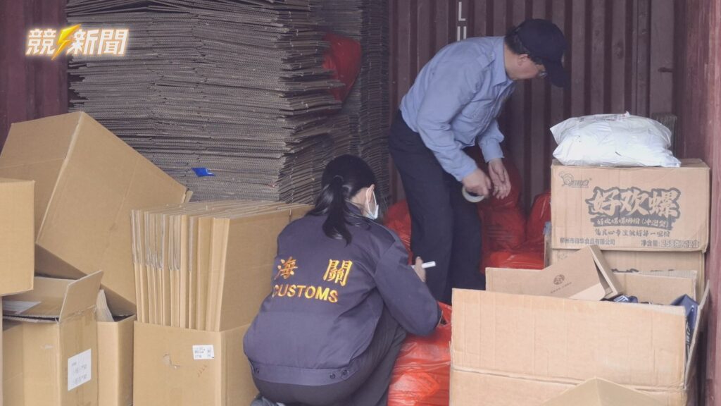海關人員進入貨櫃與倉庫深處仔細搜查,當場發現大量疑似由小三通旅客化整為零帶入、準備轉售市場的中國螺螄粉等產品。(圖:記者葉心彤/翻攝)