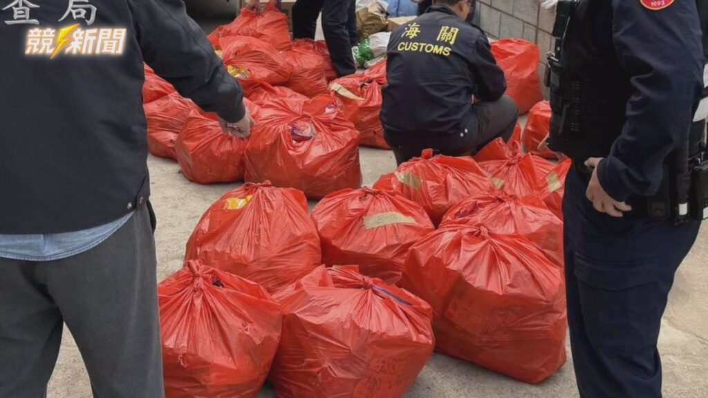 現場查扣大量裝在紅色塑膠袋內的走私農產品與食品,包含乾香菇及多款熱門中國零食,總重超過1.6公噸。(圖:記者葉心彤/翻攝)