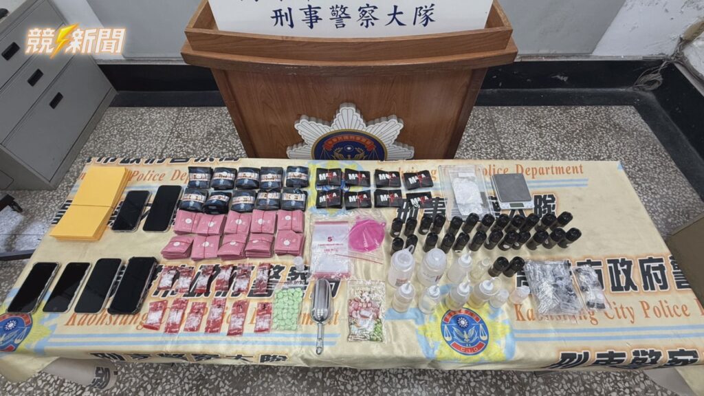 高雄市刑大展示查獲的大批毒品證物,包含數百包毒品咖啡包、K他命、毒品錠劑及電子煙油,並查扣不法所得現金21萬元。(圖:記者李佳龍/翻攝)