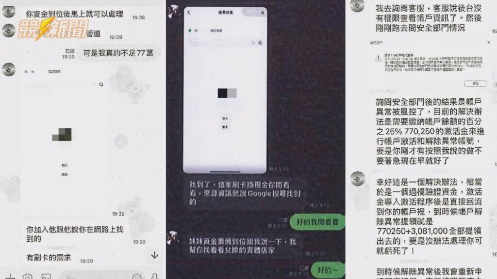 被害人與詐騙集團的對話紀錄,畫面顯示詐團成員以「資金到位才能處理」等話術,誘導被害人進行高額刷卡套現。(圖:記者李佳龍/翻攝)