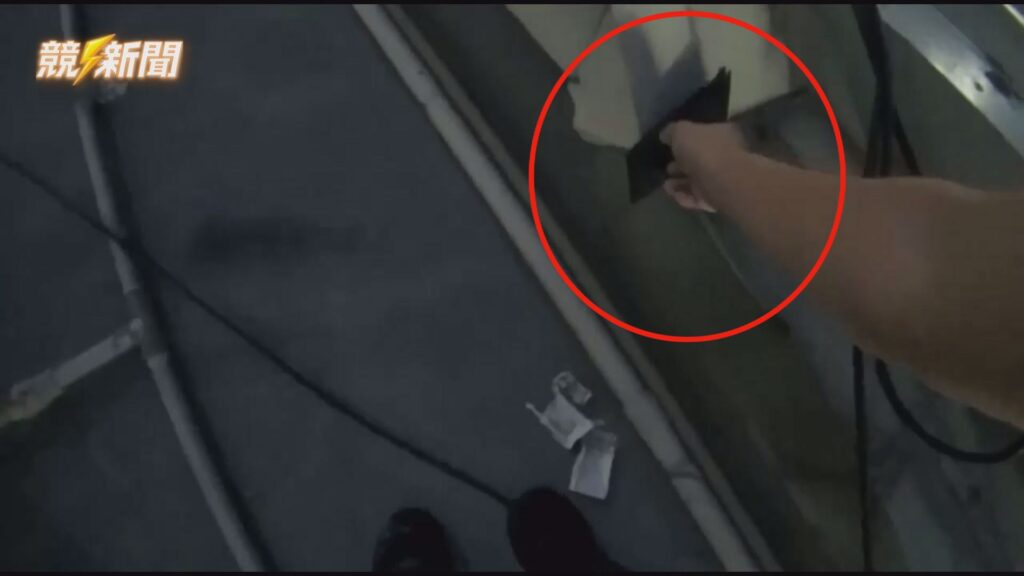 員警爬上屋頂後,打開黑色袋確認(紅圈處),裡面藏有第二級毒品安非他命及吸食器。(圖:記者羅少君/翻攝)