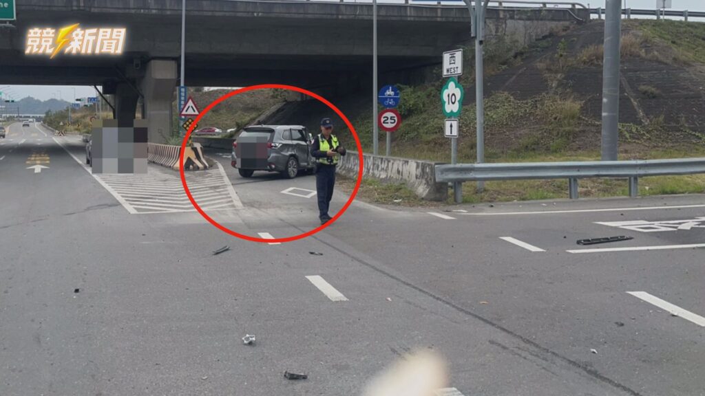 事故發生時,一輛直行自小客車與曳引車發生激烈碰撞,車體受損嚴重(紅圈處),警方隨後對雙方駕駛進行酒測並釐清責任。 (圖:記者李佳龍/翻攝)