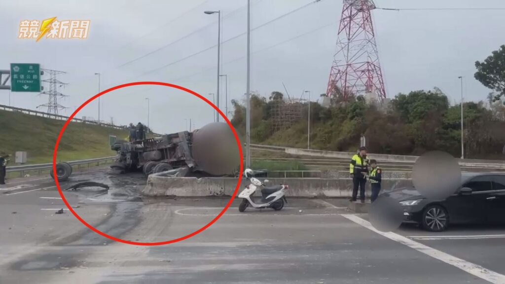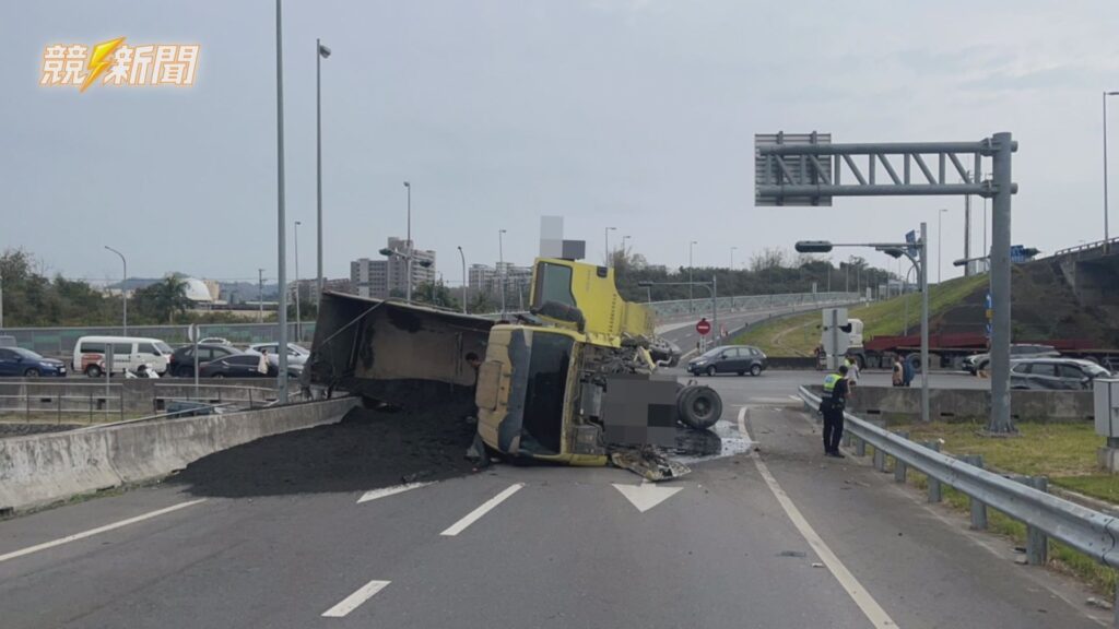 高雄燕巢區國道十號交流道口今日上午發生嚴重車禍,曳引車翻覆橫臥路中,警方趕赴現場疏導交通並展開救援。 (圖:記者李佳龍/翻攝)