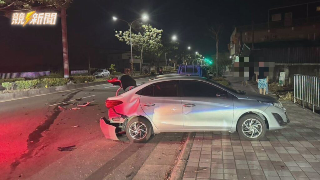 21歲吳姓男子駕駛的白色自小客車,在事故發生後車頭幾近全毀,零件散落一地。警方針對肇事原因展開進一步調查。(圖:記者羅少君/翻攝)