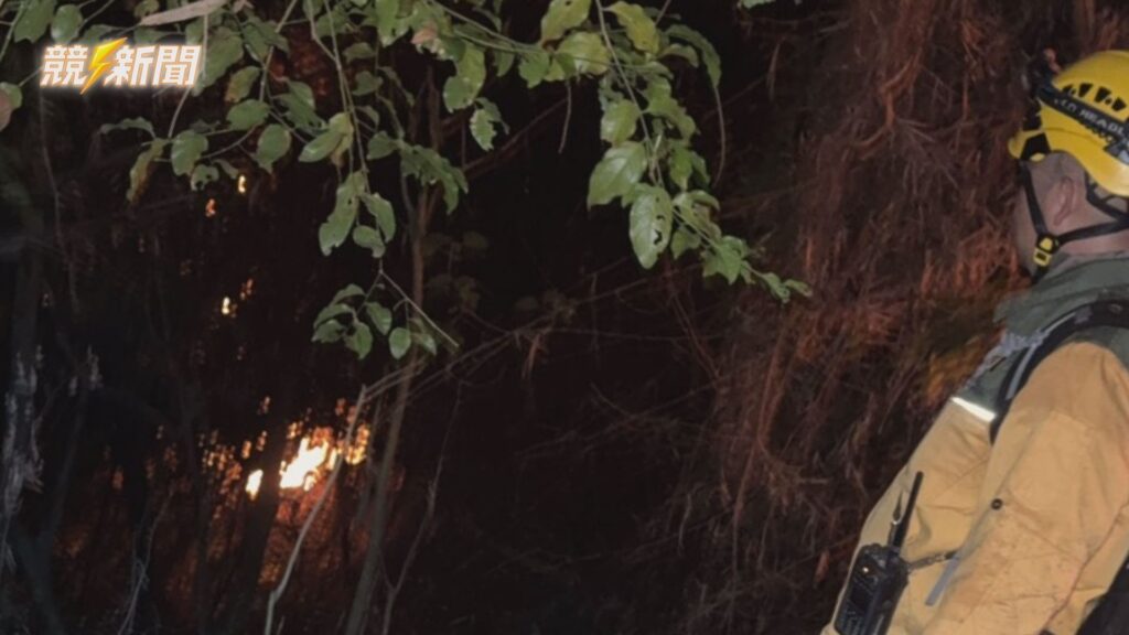 火勢入夜後仍在山間持續悶燒,消防人員漏夜留守監控,並在黑暗中觀察火場動態以防止延燒至民宅。(圖:記者李佳龍/翻攝)