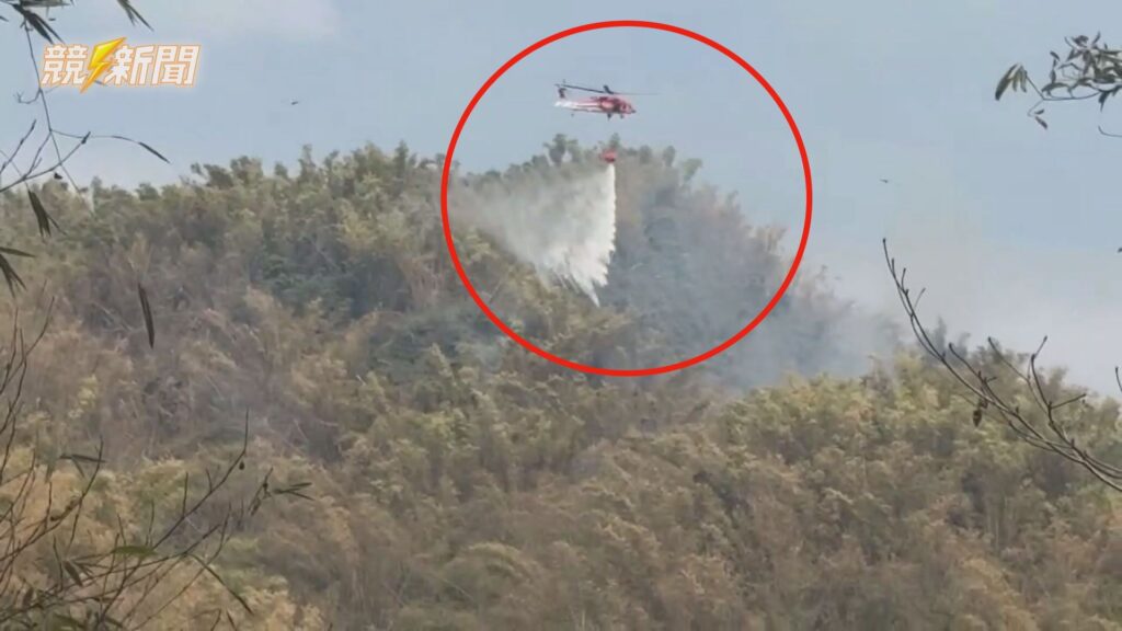 起火點地勢陡峭、人員難以接近,消防局申請空勤總隊直升機支援,從高空灑水灌救,壓制稜線火勢。(圖:記者李佳龍/翻攝)