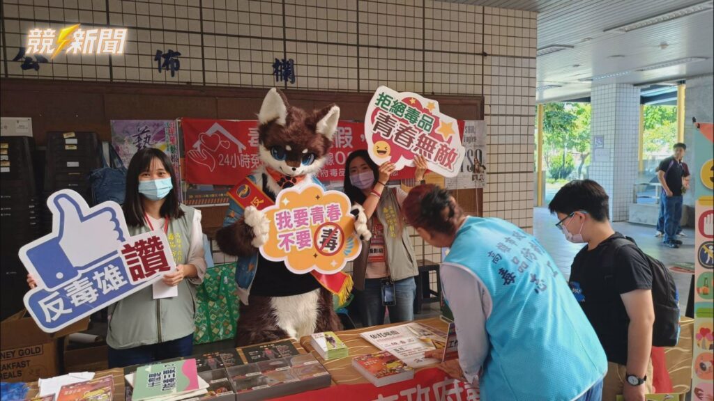 場外反毒宣導攤位,「毛毛反毒大使」人偶現身與志工一同發放文宣,宣導「反毒」正向觀念。(圖:記者李佳龍/翻攝)