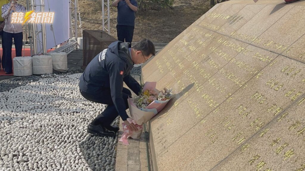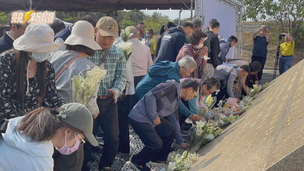 思儀式現場氣氛莊重,與會家屬及民眾依序走上前,在紀念碑前堆疊起純白花束,於海風中傳遞對逝者的無盡思念。(圖:記者羅少君/翻攝)
