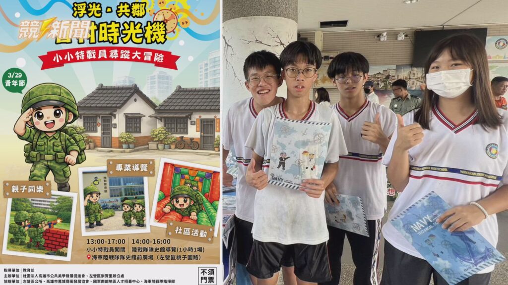 高雄左營區崇實里將於3月29日青年節推出「浮光・共鄰眷村時光機—小小特戰員尋蹤大冒險」,由高雄市公共美學發展促進會規劃辦理,透過眷村文化場域與軍事教育結合,打造一場從下午延續至傍晚的沉浸式國防教育活動,吸引親子與社區民眾走進左營軍眷歷史現場。