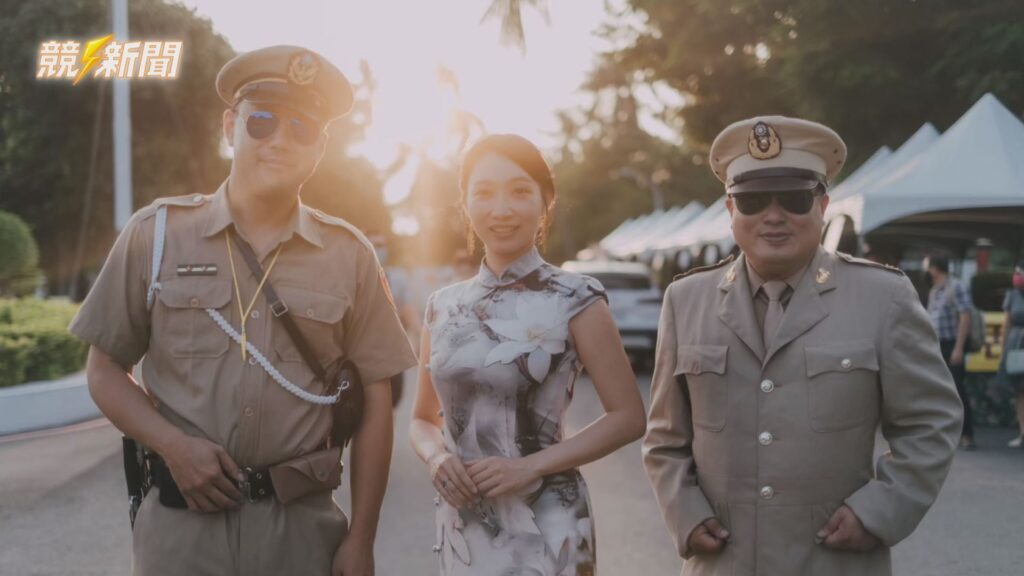 在左營眷村的夕陽餘暉下,主持人羅少君與穿著舊式軍裝民眾合影,旗袍與軍服的搭配勾勒出濃厚的眷村時光記憶。(資料畫面:記者李佳龍/翻攝)