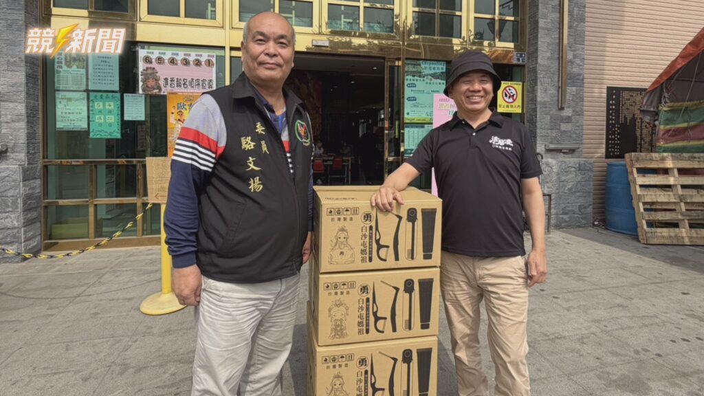 拱天宮委員駱文楊(圖左)與牙得安總經理陳京愷(圖右)合影,在今3月26日首批白沙屯媽祖牙得安隨身組送達苗栗拱天宮。(圖:記者羅少君/攝)