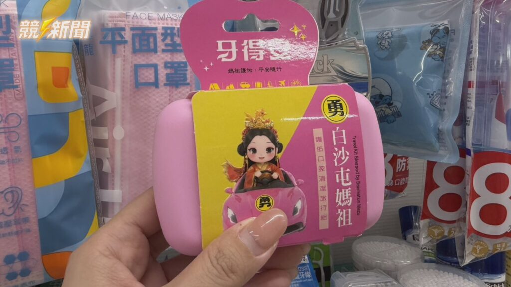 牙得安與白沙屯拱天宮首度聯名推出「媽祖旅行隨身組」,外盒印有Q版媽祖圖樣,精緻設計吸引香燈腳目光。(圖:記者羅少君/攝)