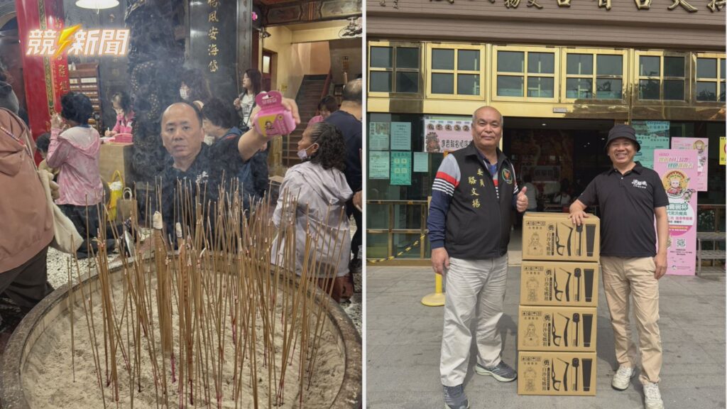 陳京愷將媽祖聯名旅行隨身組於香爐上繞圈祈福(圖左);圖右為拱天宮委員駱文楊與牙得安總經理陳京愷合影,象徵品牌與信仰的連結。(圖:記者羅少君/攝)