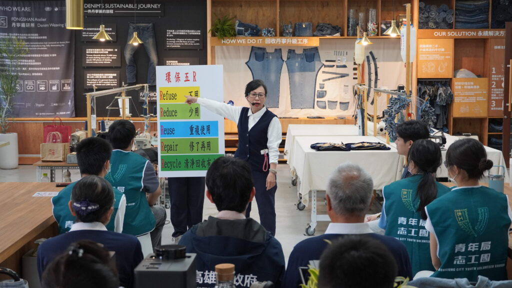 除了回收站實作,青年志工也參訪鳳山靜思堂內的「丹寧織研所」,了解廢棄牛仔布料如何透過拆解、裁切與重新設計,轉化為具實用性與設計感的再生產品。從舊衣再製到生活用品誕生,讓參與青年看見循環經濟不只是口號,而是可實際落實在生活中的創新模式。