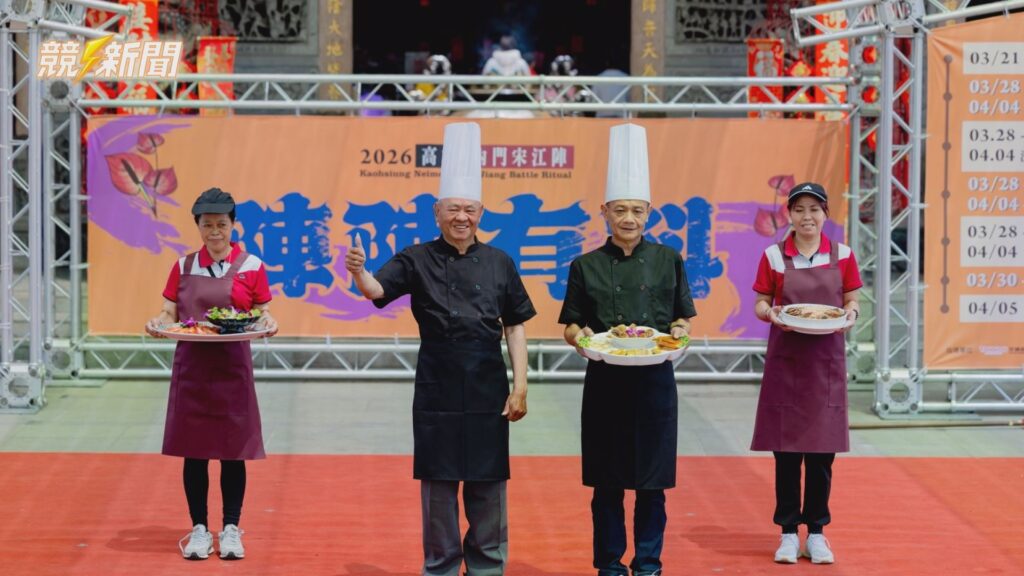 宋江大宴由在地總舖師薛志龍(右2)掌鼎,與父親薛清己(右3)共同展示手路菜,見證內門辦桌文化的世代交替。(圖:記者羅少君/翻攝)