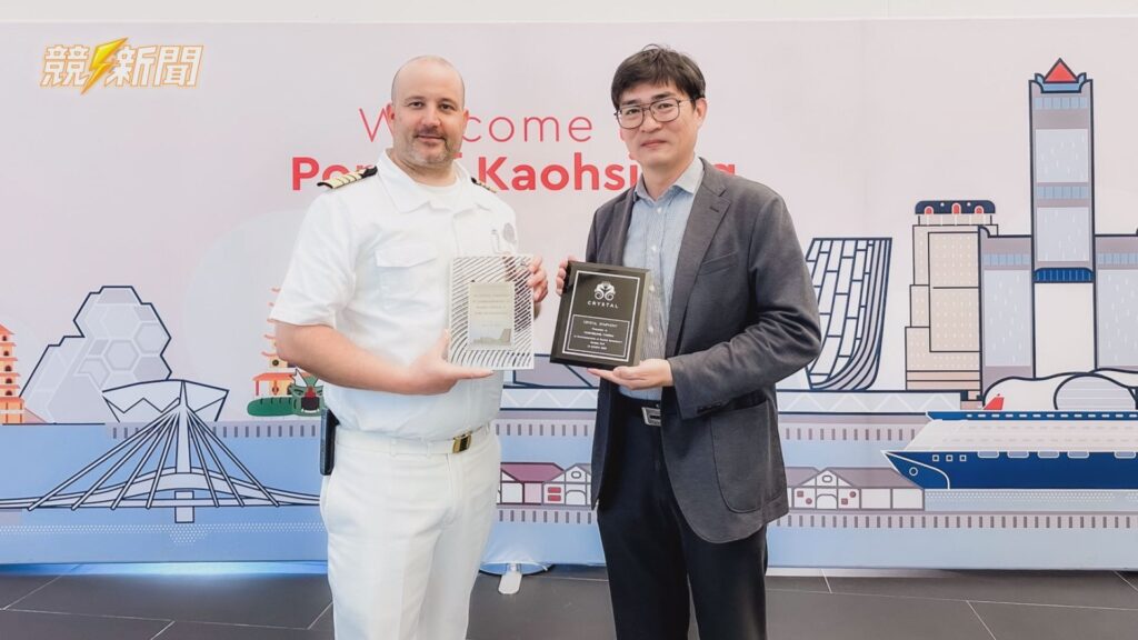 高雄港務分公司蔡建郎處長(右)代表登船致贈首航紀念牌予「水晶合韻號」船長(左),紀念雙方合作新里程。 (圖:記者李佳龍/翻攝)