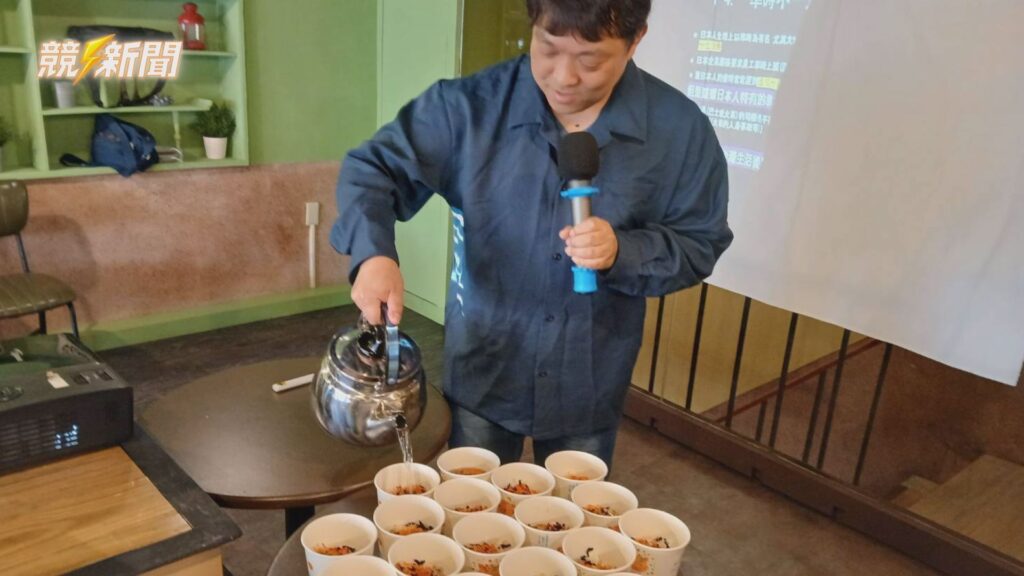 長尾老師現場示範將熱騰騰的茶湯注入碗中,完成象徵武士能量來源的傳統茶泡飯。 (圖:記者羅少君/翻攝)