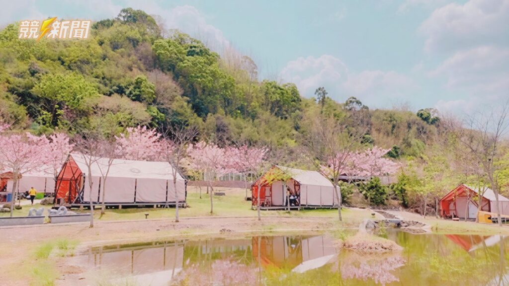 六龜寶來「遠山望月露營場」結合了豪華露營帳篷與溫泉設施,在花旗木簇擁下提供極致的野營體驗。(圖:記者羅少君/翻攝)