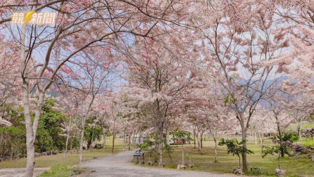 漫步在六龜寶來地區,盛開的花旗木構築成浪漫的粉紅隧道,吸引大批遊客春遊賞花。(圖:記者羅少君/翻攝)