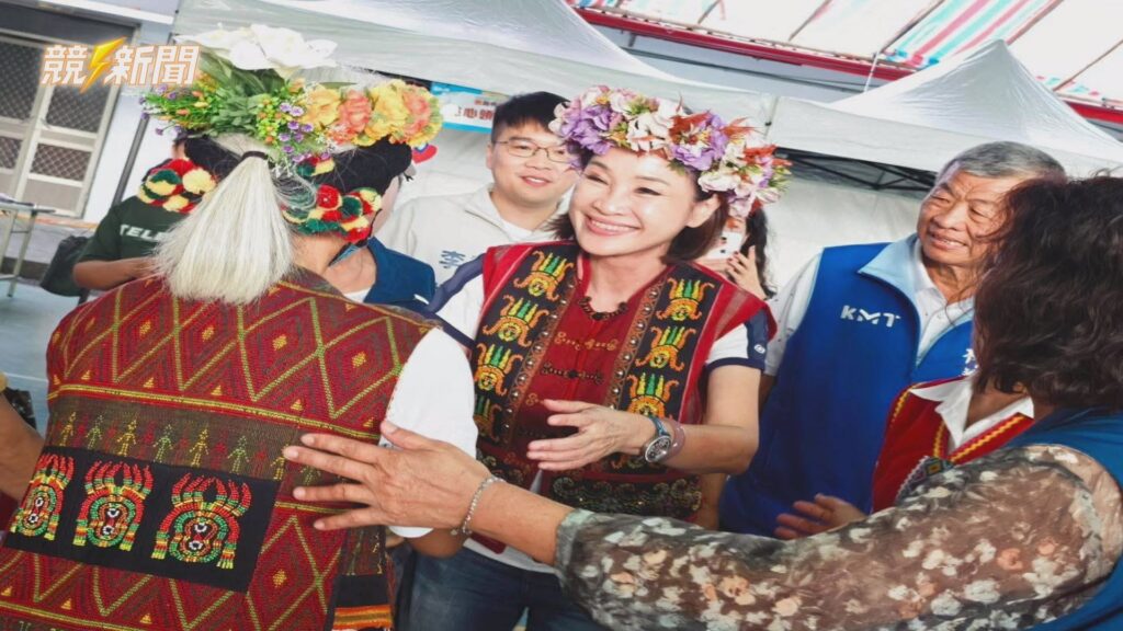 立委柯志恩頭戴部落耆老贈予的花環,並穿上原民傳統圖騰背心,與現場魯凱族婦女熱情擁抱交流,展現親民的一面。(圖:記者李佳龍/翻攝)