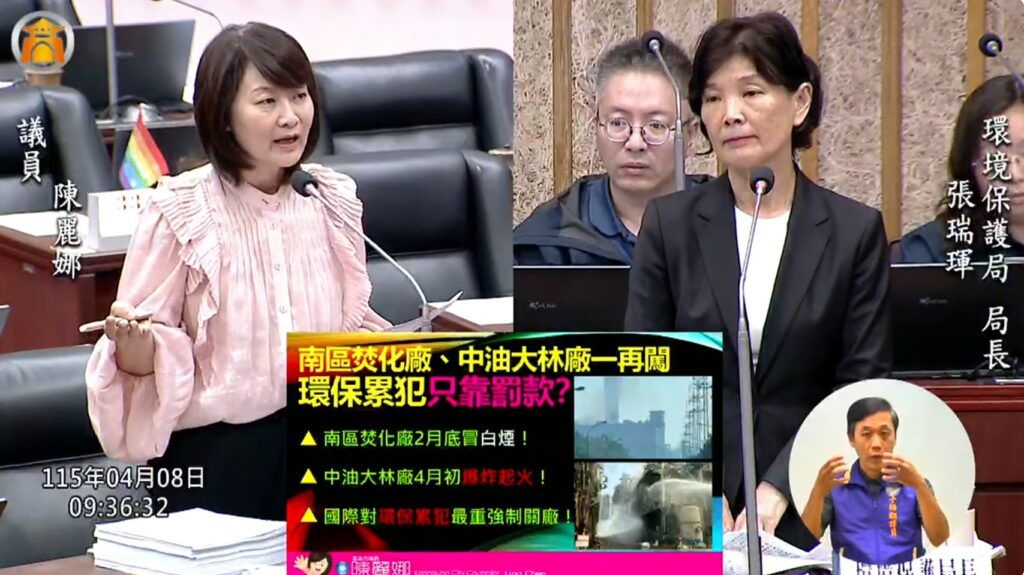 陳麗娜點名南區焚化廠與中油大林廠為環保累犯,認為市府除了開罰,應對頻傳的空污事件採取更嚴格的強制處置。 (圖:記者李佳龍/翻攝)