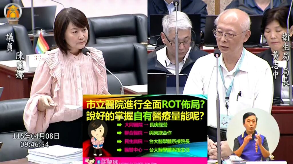 面對議員詢問市立醫院經營權移轉問題,衛生局長黃志中於席間說明合作現況與醫療資源配置。 (圖:記者李佳龍/翻攝)