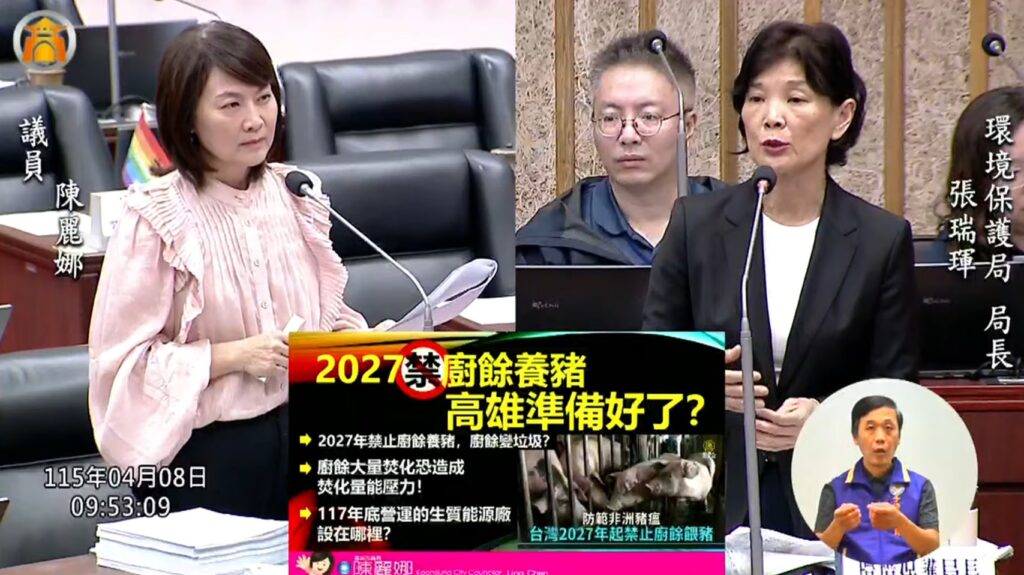 高雄市議員陳麗娜在質詢中指出,因應2027年全面禁止廚餘養豬政策,市府應提早佈局厭氧發酵設施,以減輕焚化爐的去化負擔。 (圖:記者李佳龍/翻攝)